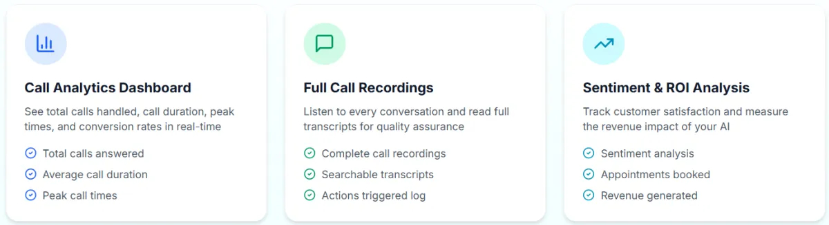 Track call volume, transcripts, appointment bookings, lead sources, and busiest times. Get weekly email reports with automatic summaries of your AI's performance.